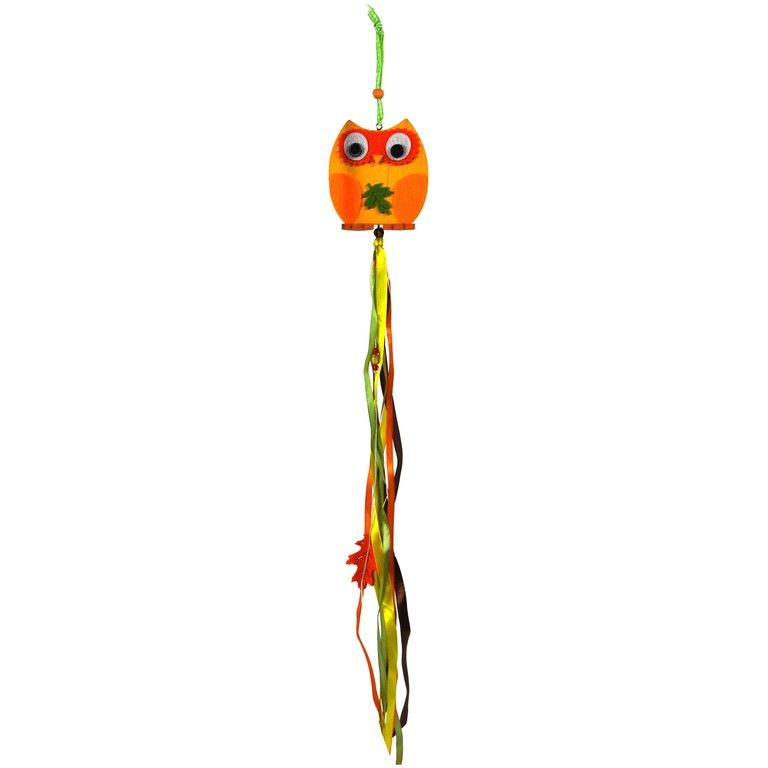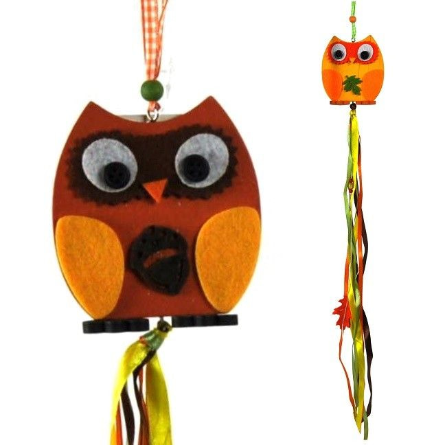 Schöne Dekoration Anhänger in Form einer Eule. Dieser Anhänger hat eine hölzerne Eule auf der Oberseite und langen Bändern / Fransen an der Unterseite.