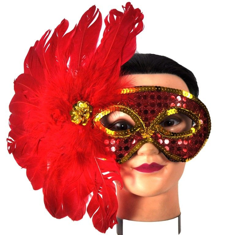 Eine herrliche Parteischablone für Veranstaltungen, Karneval und Kostümfeste. Diese Maske ist flexibel und ist köstlich mit dem Gesicht. Auf der Seite der Maske sitzen verzierten roten Federn.