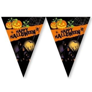 Eine Flagge Linie von 2,3 Metern lang mit dreieckigen Fahnen. Die Flaggen sind Spaß Halloween-Bilder und der Text „Happy Halloween“.