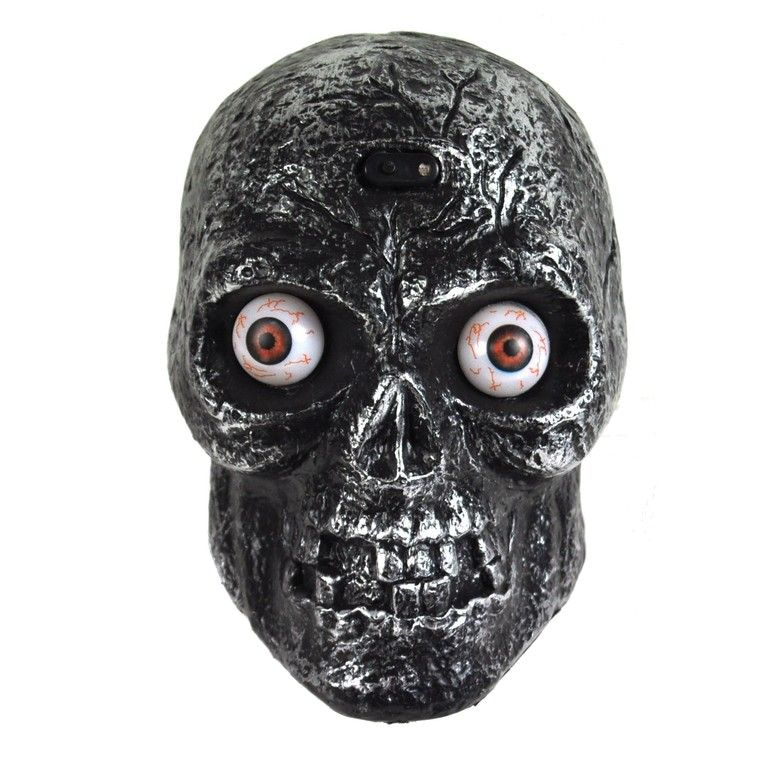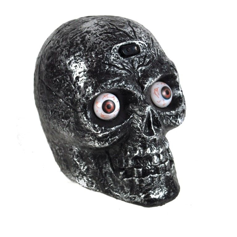 Großer Schädel mit Beleuchtung in den Augen und vielen verschiedenen unheimlich klingt. Der Schädel wird mit einem Knopf auf der Stirn zur Verfügung gestellt. Wenn die Anzeige blinkt, drücken Sie die Taste, um die Augen zu starten und unheimlich klingt kommen aus dem Schädel.
