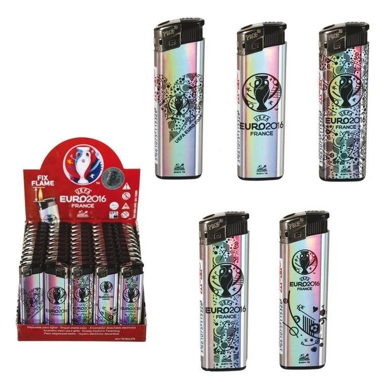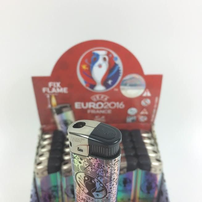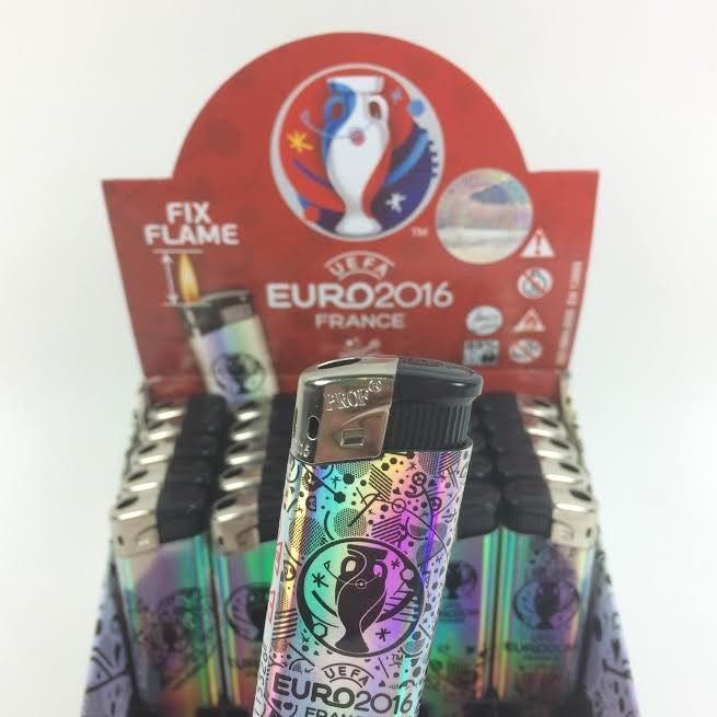 Feuerzeuge mit einer glänzenden Außenseite und der UEFA Fußball-Druck. Zusammen verpackt in einem Display.