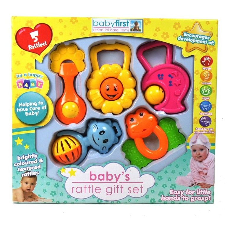 Schöne große Box mit 5 verschiedenen Rasseln gefüllt. Thanks so schönes Geschenk für ein neugeborenes Baby.