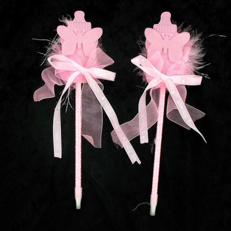 Ein rosa Stift mit einer Getränkeflasche auf der Oberseite und Schnickschnack. Ein nettes kleines etwas während eine Babyparty oder danken Ihnen Geschenk für die Gäste.