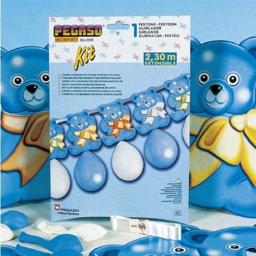 Lange Kranz von Ballons oder 2,3 Meter mit großen Dekoration Bären. Die Bären sind ca. 28 cm. hoch und haben einen Ballon am Boden hängen. Diese Schlinge ist schnell und einfach zu montieren und ist die ideale Dekoration für eine Geburt.