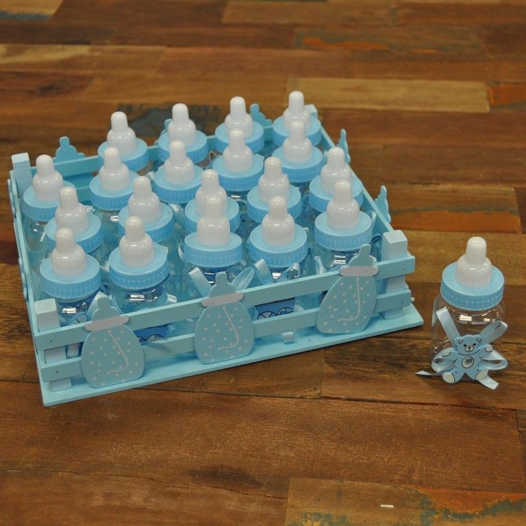 Blaue Dekoration Kiste mit Getränkeflaschen auf der Seite.