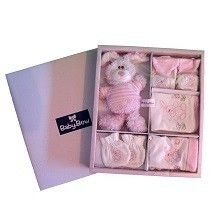 Superb Geschenk-Paket für ein neugeborenes Mädchen. Wunderschön in einem Kasten mit Deckel verpackt. Bestehend aus einem Lätzchen, Handschuhe, Mütze, Schuhe und ein Kaninchen.