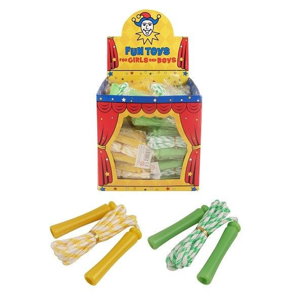 Schöne Springseile werden in 2 verschiedenen Farben geliefert: Gelb und Grün. verpackt in einem schönen großen Display von: 21 x 21 x 21 cm.