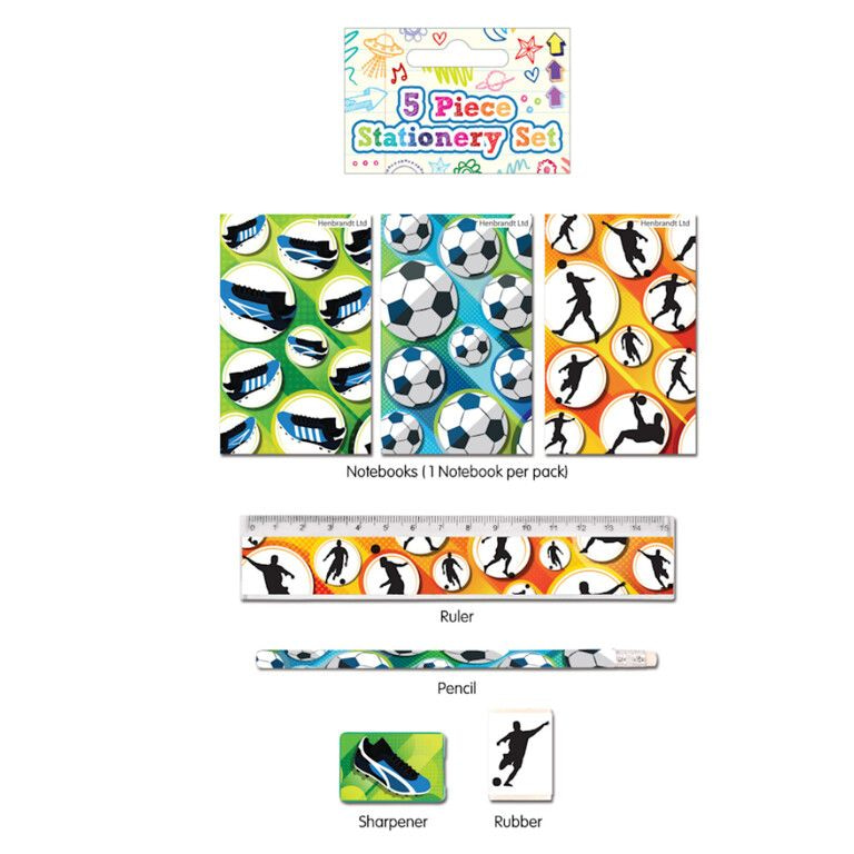 5-teiliges Fußball-Schreibset, bestehend aus: 1x Notizbuch, 1x Lineal, 1x Bleistift, 1x Radiergummi und 1x Bleistiftspitzer.