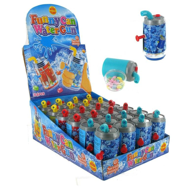Kleine Wasserpistole in Form einer Getränkedose. An der Unterseite ist ein Feld mit leckeren Süßigkeiten. Geschmackvolle Kombination für Kinder im Sommer.