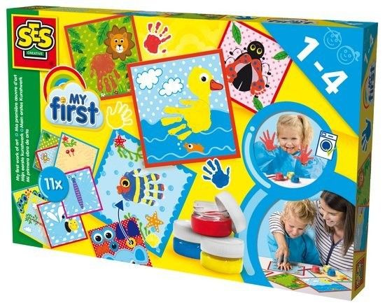 SES Mein erstes Kunstwerk ist die perfekte Möglichkeit für die Eltern ihr Kind vorstellen zu malen. Dieses Set enthält fröhlich gedruckte Karten, die zeigt, wo Sie Ihre Hand (oder Füße) platzieren können. Schmieren Sie Hand in Farbe und legt sie auf der Karte. Der Druck Details Sie fertig sind sie alle. Das Ergebnis ist immer gut!