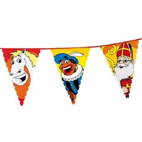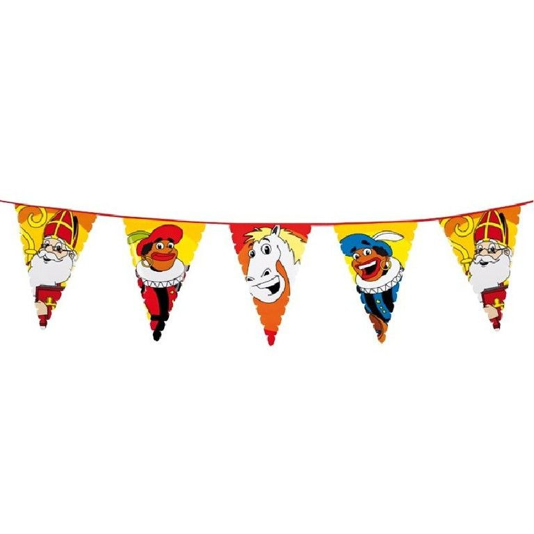 Eine große Dekoration Fahnen Linie mit Zwarte Piet, Sinterklaas und Pferd Sinterklaas. Die Fahnen Linie ist 6 Meter lang und 48 cm Fahnen. hoch.