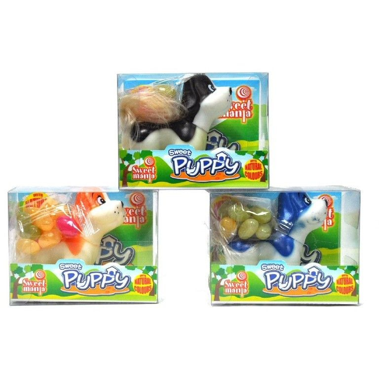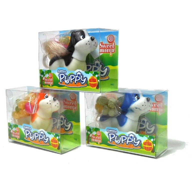 Cute dog in durchsichtigen Verpackungen verpackt. Zusammen mit leckeren Süßigkeiten verpackt.