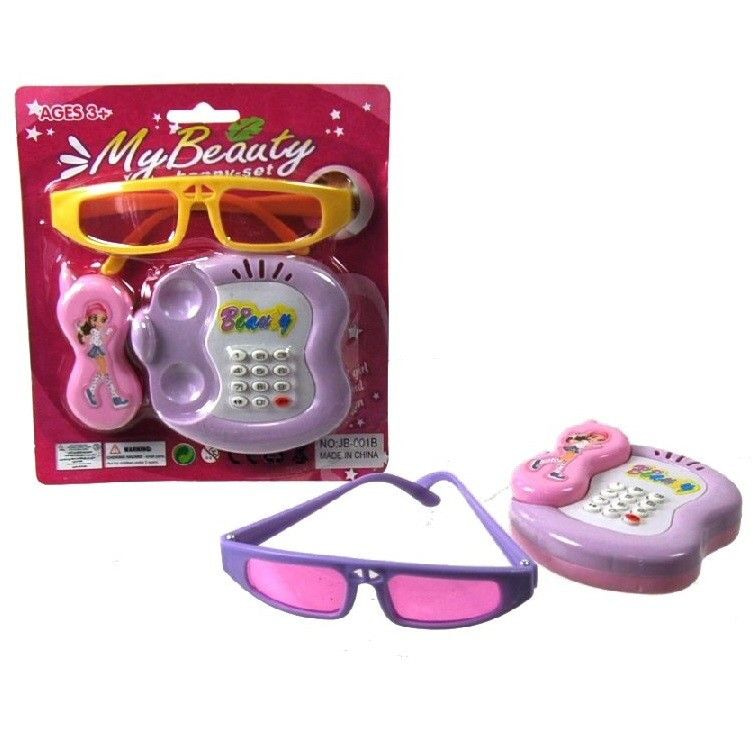 Nice little Spielplatzgeräte für Mädchen, auf Karton verpackt. Eine bunte Spielzeugtelefon, das anders macht ertönt, wenn Sie die Tasten drücken. Und einen schönen Sonnenbrille für Kinder. Batterien nicht enthalten.