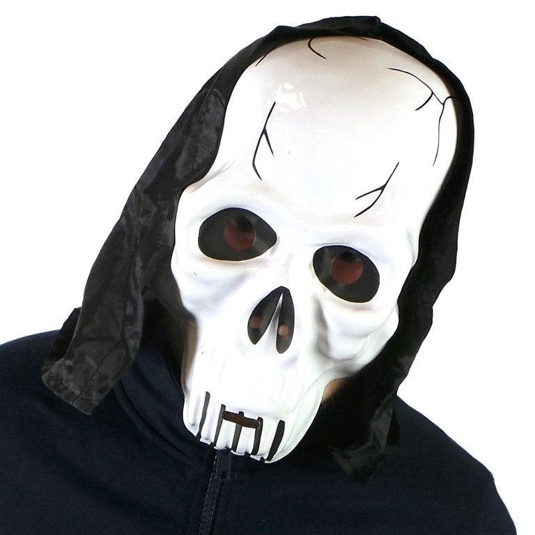 Eine Maske eines Schädels mit einer schwarzen Kapuze ausgestattet. Mit dieser Maske bezoem jeder Angst. Ideal für Partys, Karneval, Halloween und andere festliche Anlässe. Oder einfach nur schön, lassen Sie sie jemand zu erschrecken.