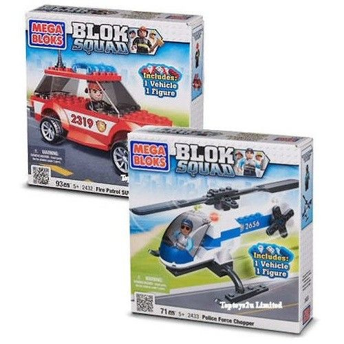 Cooles Spielzeug der bekannten Marke "Mega Bloks". Diese beiden Sets der Serie "Block Squad" und besteht aus dem Feuer Patrol SUV und der Polizei Chopper. Mit beiden Sätzen können Sie sowohl ein Fahrzeug und eine Puppe zu machen.