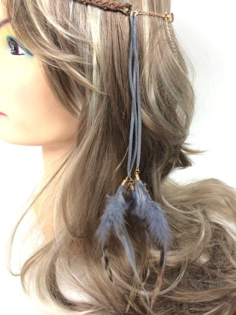 S_600023F - IBIZA LOOK geflochtenes Haar BAND MIT FEDERN Grau / Braun (1.)