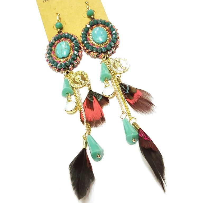 S_6446007 - OHRRINGE Münzen FEDERN & Zöpfe - TURQUOISE MODEL (1.)