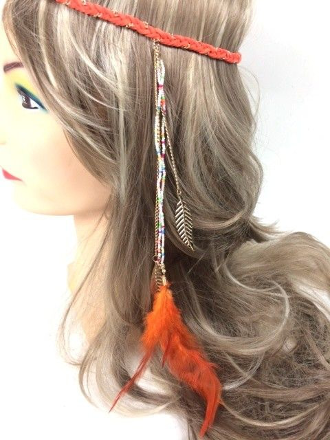 S_600024A - IBIZA LOOK geflochtenes Haar BAND MIT ORANGE FEDERN (1.)