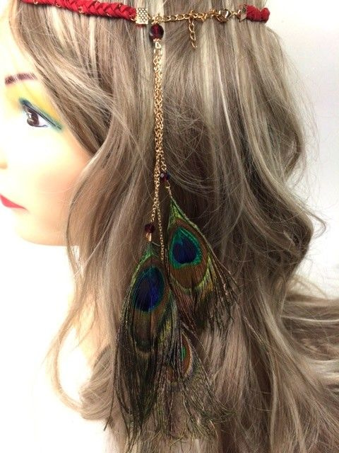 S_600029E - IBIZA LOOK BRAIDED Haarband mit Pfauenfedern BORDEAUX (1.)