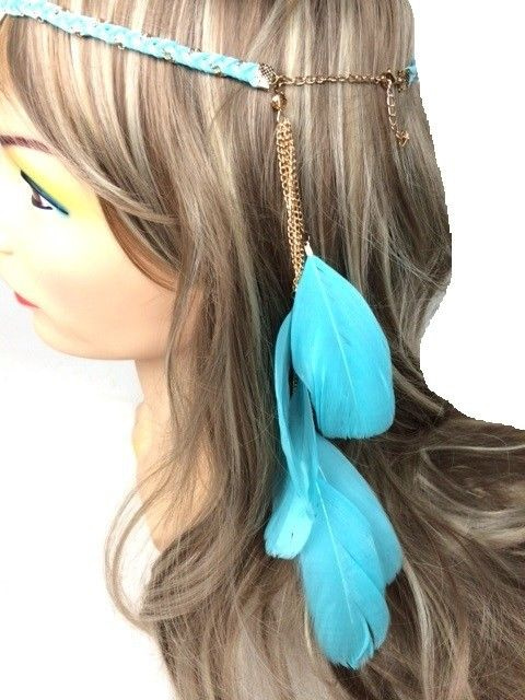 S_600027D - IBIZA LOOK geflochtenes Haar BAND MIT FEDERN TÜRKIS (1.)